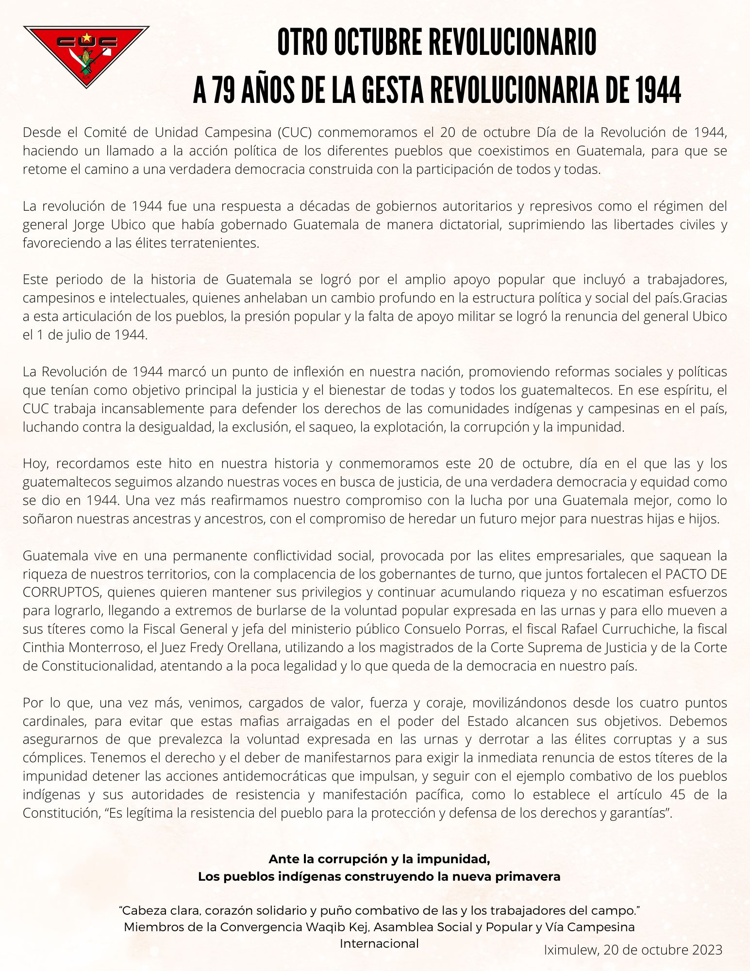 El Comité de Unidad Campesina CUC, en ocasión de la conmemoración del Día Internacional de la Mujer el 8 de marzo, extiende un saludo fraterno a las mujeres indígenas, campesinas, trabajadoras, artesanas, comadronas, sanadoras y a todas las defensoras de los derechos humanos, del territorio, de la madre tierra, del agua y de la VIDA. Rendimos homenaje y expresamos nuestro eterno agradecimiento a aquellas que nos precedieron en esta lucha contra la inequidad y la injusticia.